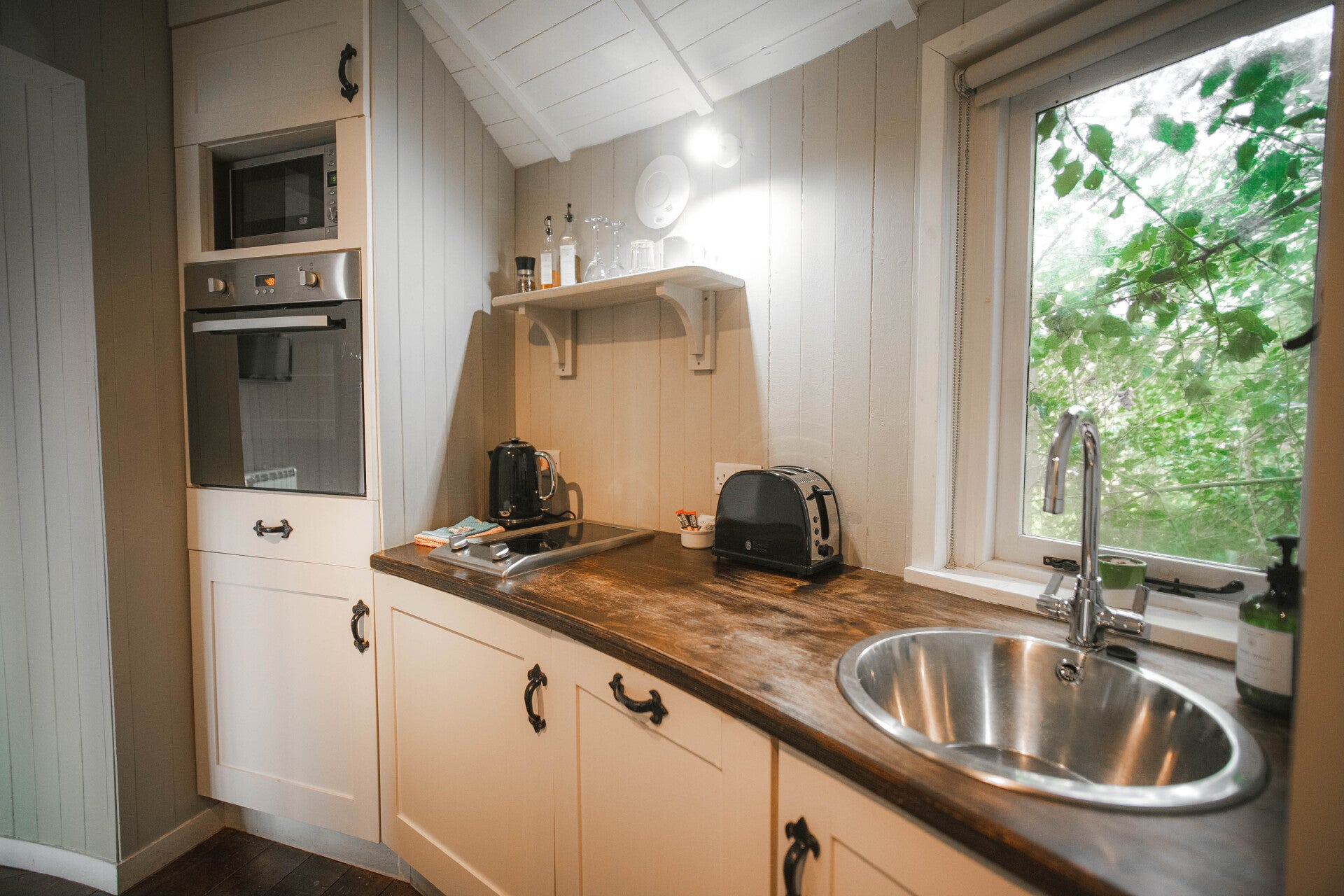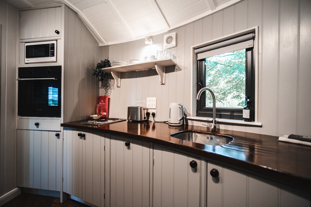 The two cosy Shepherds Huts sit in the orchard enclosed by beech hedges. Each hut has a double bed, kitchenette, small bathroom and private outdoor seating area. The huts are fully insulated and heated, and also have small log burners.