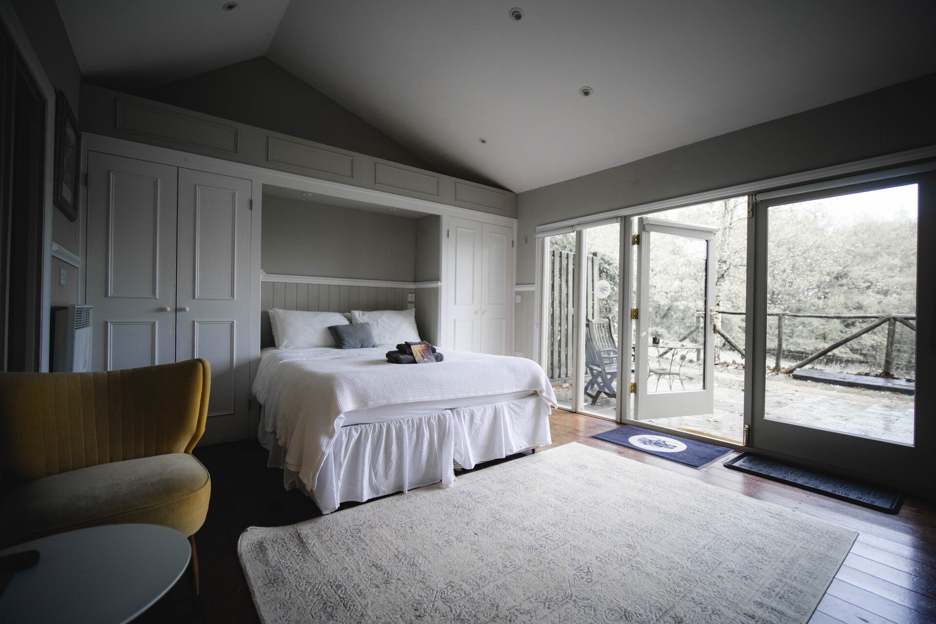 The Hay Barn is a spacious detached converted barn nestled in the same ancient tree line as the eco-lodge tree houses, overlooking the Alpaca fields and providing an open-plan studio space with kitchenette, double bed, seating, shower room and fully glazed doors leading to a private patio screened by native trees.